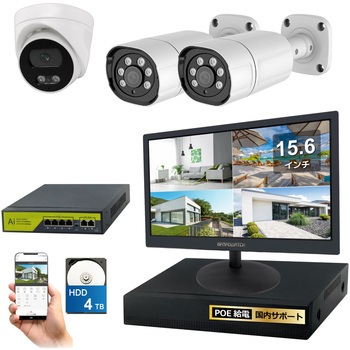 4k(800万画素)PoEタイプNVR防犯カメラセット バレットカメラ2台 ドームカメラ1台、15.6インチモニター、HDD4TB付き