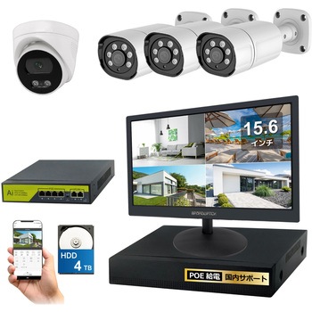 800万画素(4k)の高画素対応LANケーブル経由で電気を供給するので、電源を取れない場所にもカメラを設置できる配線がすっきりする(省配線)専用アプリと接続することで、外出先からスマホで映像を確認することができる赤外線LED搭載の高画素カメラで、夜間でも撮影が可能(モノクロ撮影)録画機はサイクル録画機能で常に最新データをハードディスクに保存
