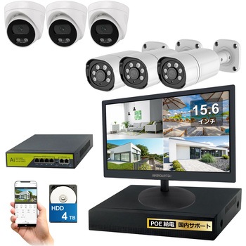 4k(800万画素)PoEタイプNVR防犯カメラセット バレットカメラ3台 ドームカメラ3台、15.6インチモニター、HDD4TB付き