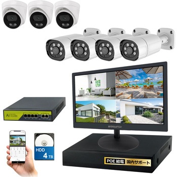 4k(800万画素)PoEタイプNVR防犯カメラセット バレットカメラ4台 ドームカメラ3台、15.6インチモニター、HDD4TB付き