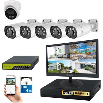 800万画素(4k)の高画素対応LANケーブル経由で電気を供給するので、電源を取れない場所にもカメラを設置できる配線がすっきりする(省配線)専用アプリと接続することで、外出先からスマホで映像を確認することができる赤外線LED搭載の高画素カメラで、夜間でも撮影が可能(モノクロ撮影)録画機はサイクル録画機能で常に最新データをハードディスクに保存