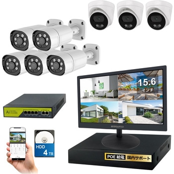 4k(800万画素)PoEタイプNVR防犯カメラセット バレットカメラ5台 ドームカメラ3台、15.6インチモニター、HDD4TB付き