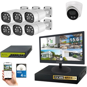 4k(800万画素)PoEタイプNVR防犯カメラセット バレットカメラ6台 ドームカメラ1台、15.6インチモニター、HDD4TB付き