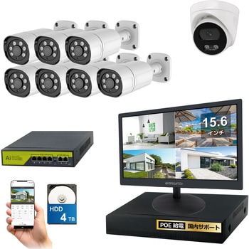 4k(800万画素)PoEタイプNVR防犯カメラセット バレットカメラ7台 ドームカメラ1台、15.6インチモニター、HDD4TB付き