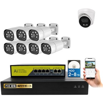 800万画素(4k)の高画素対応LANケーブル経由で電気を供給するので、電源を取れない場所にもカメラを設置できる配線がすっきりする(省配線)専用アプリと接続することで、外出先からスマホで映像を確認することができる赤外線LED搭載の高画素カメラで、夜間でも撮影が可能(モノクロ撮影)録画機はサイクル録画機能で常に最新データをハードディスクに保存