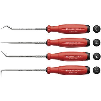 セット内容:スイスグリップEVOピックツール(38675・38676・38678・38679)、ロールケース。ピックツール4本セットです。軸根元にローレット加工を施しています。先端が他社に比べて丸みを帯びており、対象物に傷がつき難い工夫もされています。 スイスグリップEVOは3種の素材からなる新型ハンドルです。ハンドル形状は円形に改良されており、使用時の疲労が少ないだけでなく、旧ハンドルと比較してトルク伝達が25%向上されました。ハンドル後部にはドライバーの先端形状のシンボルマークとサイズを表示していますので、作業に適したドライバーをすぐに選ぶことができます。ハイテク3K素材により、耐薬品性と機械的性能が強化されており、油や濡れた手で握っても滑りにくく、安全に使用できます。3Kハンドルの内部のコア素材は100% リサイクルされた硬質素材です。外側(中層コア)は部分的にリサイクルされた硬質素材です。最も外側は高性能な柔らかい素材が使用されています。外箱付きです。ロールケース付きです。