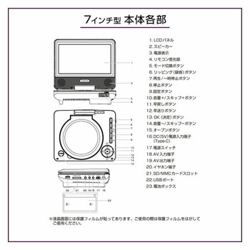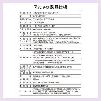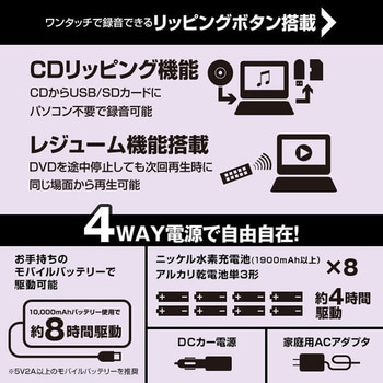 用途DVD再生プレーヤーとして。車載用 AC DC 乾電池 モバイルバッテリー CDリッピング機能 レジューム機能搭載 車載用ケース付き付属品リモコン、リモコン用電池(単4形乾電池2本)、AC電源アダプター、シガー電源アダプター、電源供給用USBケーブル、AVケーブル、車載取付用本体収納ケース、取扱説明書(保証書付)使用温度(℃)0~40保存温度(℃)”-10~60入力端子AV入力端子出力端子AV出力端子、イヤホン端子適合バッテリー5V/2.0A以上 容量10000mAh以上を推奨(別売)バッテリー稼動時間【モバイルバッテリー】8時間(10000mAh時)再生可能ファイル形式DVD、 DVD-R/DL、 DVD-RW、CD、 CD-R/RW、 SD/USBメモリー(最大16GBまで)再生形式DVD-Video、 DVD-VR、 CPRM、 CO-DA、 MPEG1、 MPEG2、 AVI、 MP3、 WMA、 JPEGシステム対応【カラ―】NTSC/PAL 自動変換内容量1台