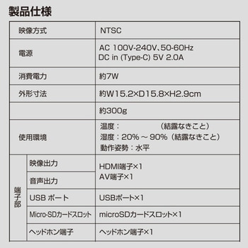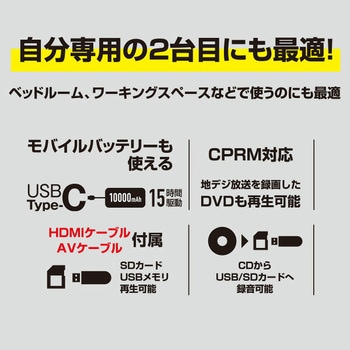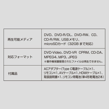 HDMIケーブル付属 軽量コンパクト! 自分専用の2台目にも最適端子部・映像出力:HDMI端子×1 AV端子×1・音声出力:HDMI端子×1 AV端子×1・USBポート×1・SDカードスロット×1・ヘッドホン端子対応メディア:DVD、DVD-R、DVD-R/DL、DVD-RW、CD、CD-R/RW、USBメモリ、microSDカード(32GBまで対応)対応フォーマット:DVD-Video、DVD-VR、CPRM、CD-DA、MPEG4、MP3、JPEG