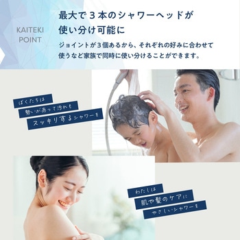 毎日のバスタイムをより”カイテキ”に!・シャワーヘッドをワンタッチで付け替えできる最大で3本のシャワーヘッドの使い分けが可能になります。・360度回転する!シャワーヘッドが自由自在に回転し機能性UP!シャワーヘッドの根元が360度くるくる回る仕様になっており、水圧の影響による使いづらさも軽減します。・衛生面も向上着脱が簡単なのでシャワーヘッドの残水を簡単に抜くことができます。