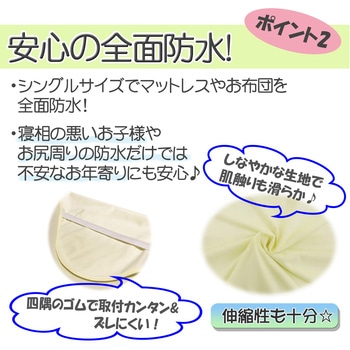 さらっとしなやかなスムースニットを表裏両面に貼り合わせた3層の防水シーツ。シングルサイズのマット全面用で四隅にズレ防止のゴムが付いたタイプ。表面スムースニット+ポリウレタンフイルム+裏面スムースニットの3層になっており、ポリウレタンフィルムを中心に挟み込むことで、繰り返しの洗濯にも強く、耐久性に優れています。