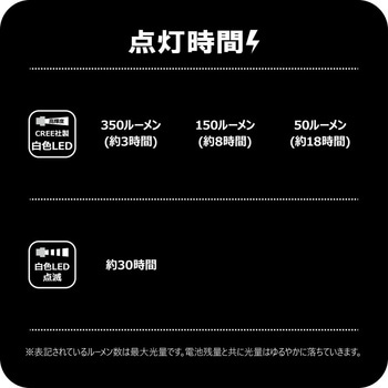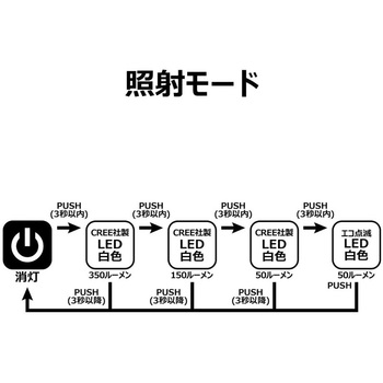 点灯時は毎回350ルーメンより照射に設定(メモリー機能なし)。
