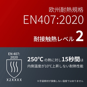欧州規格EN407:2020コンタクトヒートに適合しており、250℃までの接触熱に対し、15秒までの耐熱性があります。