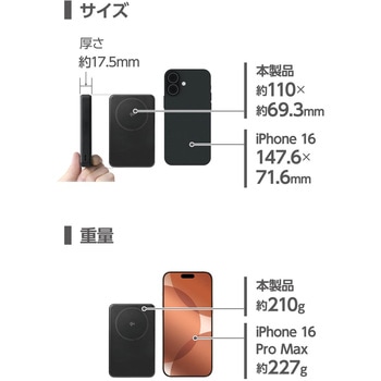 用途Qi2対応iPhoneにマグネットで取り付け、最大15Wでワイヤレス充電できるモバイルバッテリーです。