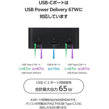 USB Type-Cポートを2ポート、USB-Aポートを1ポート搭載。2ポート同時接続時で、合計最大65Wの出力が可能な高出力モデルです。
