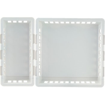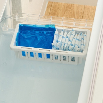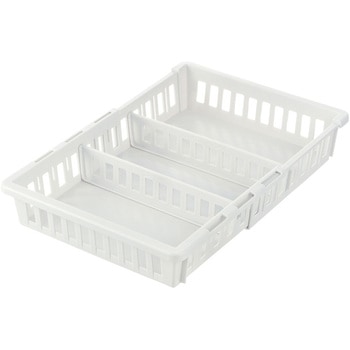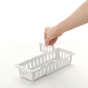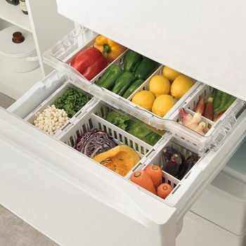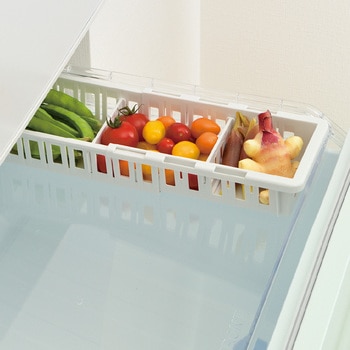 冷蔵庫の野菜室や冷凍室の整理整頓に。野菜室や冷凍室のスライドトレーのすき間を有効活用できる浅型伸縮ストッカーです。収納する食材や庫内スペースに合わせて、幅を調節できます。全面スリットで通気性がよいので、食材が冷えやすいです。2枚の仕切りの位置は、用途に合わせて調節できます。レギュラー、スリムは同じ伸縮幅なので、並べて使用できます。