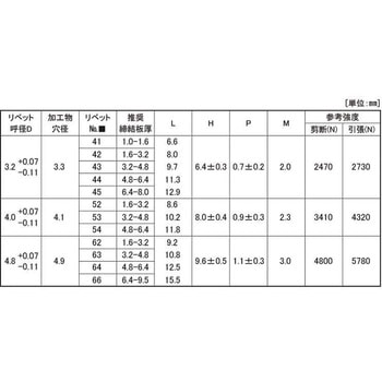 ステンレススチールリベット(JIS SUS305)ステンレススチールマンドレル(高張力ステンレス線)リベットボディー材質に、ステンレススチールを用いており、高強度、高耐食を必要とする締結に適しています。