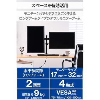 モニターの位置を自由に調節でき、デスクのスペースを有効活用!17~32インチまでのモニターに対応する、ロングアームタイプのダブルモニターアーム。モニターからのケーブルをすっきりまとめることができる、ケーブルホルダー付きです。