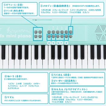 自動演奏(8曲):「きらきら星」や「カノン」など8曲を自動再生します。(楽曲一覧:きらきら星、フレール・ジャック、メリーさんのひつじ、ゆかいな牧場、ちょうちょ、エリーゼのために、トルコ行進曲、カノン)