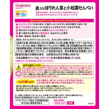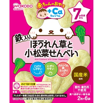 国産米を使用しほうれん草と小松菜を練り込んだお米の味が分かる口どけしやすいおせんべいです。お子さまの月齢に合った口どけ固さ味付けに配慮しにぎりやすいつまみやすい形状にしたママパパも安心してあげられる鉄やカルシウム入りのおやつシリーズです。