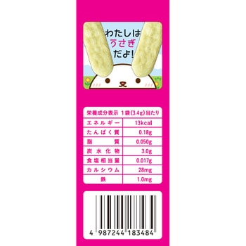 用途本品製造ラインではえびかにを含む製品を製造しています。間食1回につき1袋を目安にお召し上がりください。【のどづまり注意】お子さまがのみこみ終わるまで必ず見守ってあげてください。【必ずお読みください】お子さまがじゅうぶんになめとかしたりかみくだいたりして上手にのみこみ終わるまで必ず見守ってあげてください。口の中に一度にたくさんの量が入らないように見守ってあげてください。お子さまが横になっている時やおんぶしている時激しく泣いている時にはあげないでください。食べている時や食べ終わった後は湯ざましや麦茶などをあげてください。慣れない頃は湯ざましに浸すなど水分を含ませてからあげてください。月齢は目安です。お子さまの食べる様子をみてあげてください。【こうして食べよう】小さく割ると食べにくくなり上手にのみこめないことがあります。割らずにそのままあげてください。焼き色に濃淡がある場合がありますが品質には問題ありません。黒い粒がみられますが原料の一部ですので安心してお召し上がりください。湿気を嫌いますので開封後はなるべくお早めにお召し上がりください。