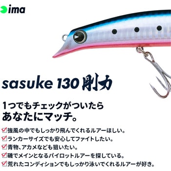 【剛よく海を制す。】*安定した飛行姿勢が生み出す圧倒的飛距離。*大型フック搭載。パワーファイトにオススメ!*荒れたフィールドでもしっかり泳ぐ! Sasukeシリーズ最高のパワーモデル。強風をものともしないキャスタビリティーと、荒れた海面でもしっかり水を捉える力強い泳ぎが特徴。ラフなコンディション下での釣りや大型狙いの釣りに安心してのぞむことができます。大型の#2フックを搭載しており、ランカーシーバスや青物、アカメなどを狙ううえでは必携のsasukeです。