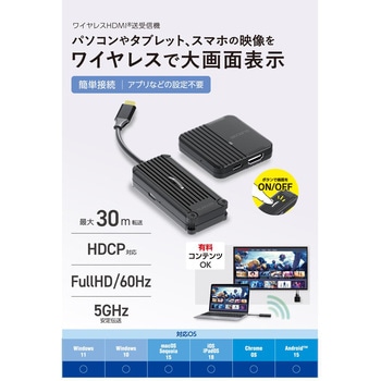 仕様●伝送遅延:最大200ms●最大ペアリング台数:1台適合映像表示機器:HDMI(R)入力端子を搭載したテレビ・ディスプレイ・プロジェクターなどセット内容受信機×1、送信機×1、受信機給電用ケーブル(約9cm)×1色ブラック質量(g)1:【受信機】約22、2:【送信機】約36対応OS(Windows)Windows 11/10、(Android)Android 15、(iOS)iOS 18、(iPadOS)iPadOS 18、(macOS)macOS Sequoia 15コネクタ形状1:【受信機】映像出力:HDMI タイプA 19ピンポート×1、電源入力:USB Type-Cポート×1、2:【送信機】映像入力:USB Type-Cプラグ×1、電源入力:USB Type-Cポート×1寸法(幅W×奥行D×高さH)(mm)1:【受信機】約55×約55×約12、2:【送信機】約76×約35×約16※ケーブル含まず適合機器USB Type-C(TM)ポートを搭載し、DisplayPort(TM) Alt Modeに対応したパソコン、スマートフォン、タブレット解像度最大出力表示:FullHD(1920×1080px)/60Hz保証期間1年間使用環境温度(℃)0~40ケーブル長(cm)【送信機】:約5 ※コネクター含まず使用環境湿度(%)10~85(結露なきこと)周波数(GHz)無線:5伝送距離(m)最大:30(障害物のない状態)設置条件屋内専用HDCP対応HDCP1.4内容量1個