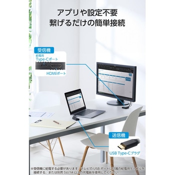 パソコンやタブレット、スマホの配信動画をワイヤレスで大画面表示!USB Type-C(TM)搭載のパソコンやスマートフォン、タブレットなどの映像・音声を、テレビやディスプレイ、プロジェクターなどのHDMI(R)搭載映像機器に出力できる、コンパクトなワイヤレスHDMI送受信機です。アプリやドライバー不要で、ワンタッチ接続できます。