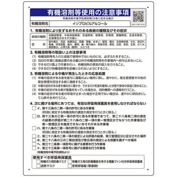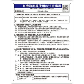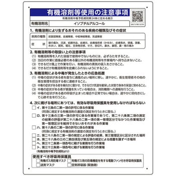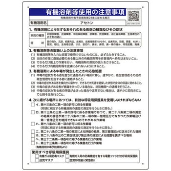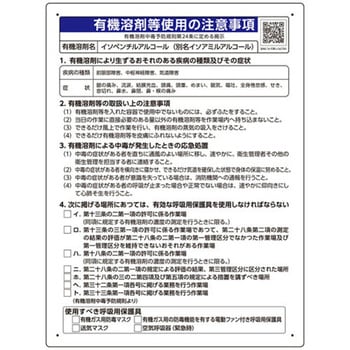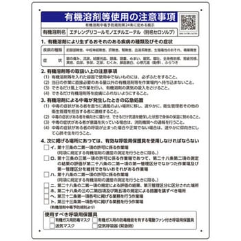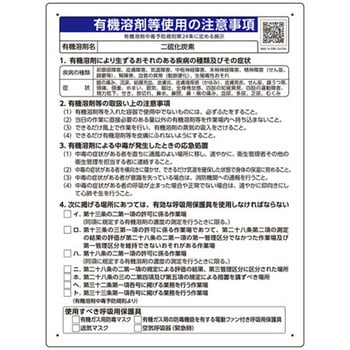 労働安全衛生法 有機溶剤中毒予防規則第24条に基づく法令表示品です。2024年2月 労働安全衛生規則等の一部を改正する省令(令和4年厚生労働省令82号)改正法令の追加項目である疾病・症状・使用すべき保護具等の掲示が義務付けられました。法令内容が確認できる二次元コード付きです。化学物質名を初めから記載した標識です。
