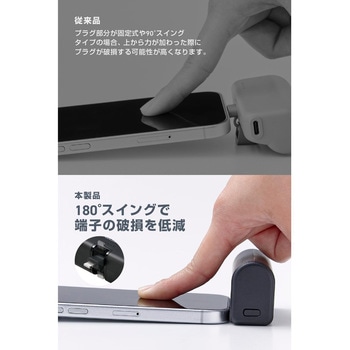 一体型コネクターは180度可動するスイング構造。余計な負荷からコネクターを守り、収納時は90度に折りたたんで安全に持ち運べます。