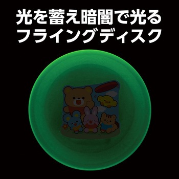 昼も夜も楽しめる!暗い場所で光るフライングディスク!日中の太陽光や蛍光灯の光を吸収して、夜や暗い場所でふんわり光るフライングディスクです。屋内はもちろん、発光するので視認性も良く、夜の公園やキャンプなど屋外でも幅広く活躍します。軽量で投げやすく、お子さまから大人まで楽しめます。かわいい動物たちのシール付きです。
