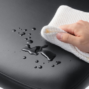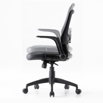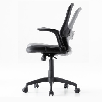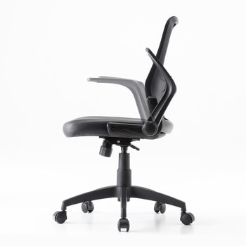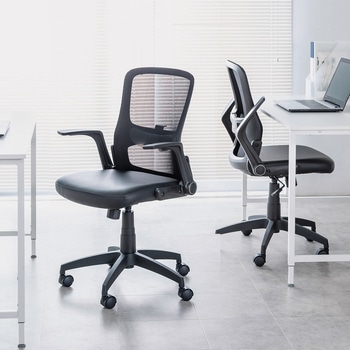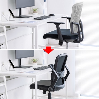 背もたれ、座に涼しいメッシュ素材を使用し、蒸れにくく快適。座面にビニールレザーを採用し、汚れや水分がついてもすぐに拭きとれます。座面はクッション製も高く、すわり心地も抜群です。使わない時に倒しておける便利な可倒肘装備。座面下のレバー一本で座面の高さが調節できます。腰の負担を軽減するランバーサポート装備、上下に可動可能。