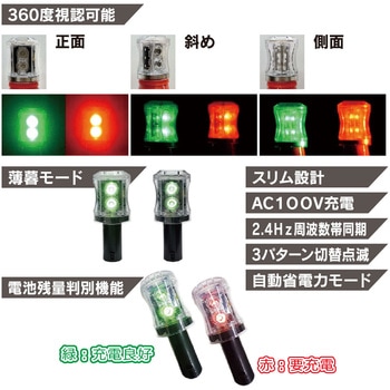 タクトアイズ2.4は2.4GHz周波数帯(マルチキャスト通信)を使用した同期点滅が可能です。製品同士が通信して同期するため、天候や場所、設置環境に捉われない安定した同期が可能です。円筒状のため360度視認可能で、斜めや真横から見た際も発光部位が広く、どの角度からも視認性良好です。高速点滅による残像効果と同期点滅により工事規制ラインを従来よりも長い時間視認可能です。3種類の発光パターンを自動切換でドライバーの目を慣れさせず注意喚起を促します。コーンバー(Φ80mmまで)が通るスリム設計です。薄暮時に高輝度発光する薄暮モードで、視認性が落ちる時間帯の安全性を向上させます。