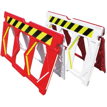 シェブロン型のシートがしっかり光を反射し、夜間でも目立ちます。保安灯・チェーン・コーンバー等を取り付ける事で、様々な使用シーンに対応します。A型バリケード用ウエイトを最大3個使用可能です。より安定してご使用頂けます。矢印板として方向誘導、視線誘導に役立ちます。