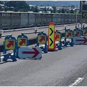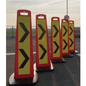 矢印板より視線が高く視認性もアップしている工事用表示板になります。両面高輝度反射で夜間でも安心です。本体とウェイトが分離式でスタックも可能で施工性も早く、すばやく設置できます。強風対策で別売りのベースを重ねて使用できます。
