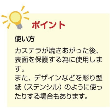 カステラが焼きあがった後、表面を保護するために使用します。デザインなどを彫り型紙(ステンシル)のように使用する場合もあります。