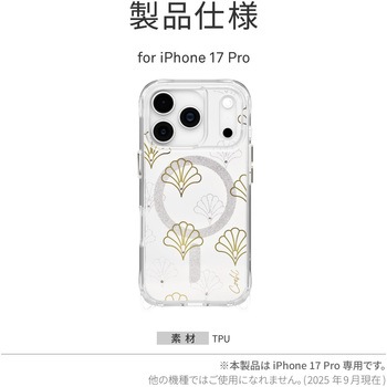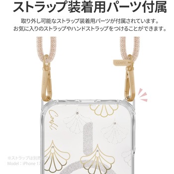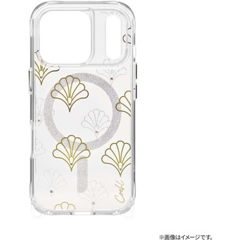 3Dイルミネクリスタルが埋め込まれ、キラキラした貝殻のモチーフで飾られたクリアケース/耐久性も兼ね備える/触覚的なメタリックボタンと盛り上がったカメラベゼルを備える/スリムで手にフィット/最大2.5mからの落下に耐える/磁気ワイヤレス充電に対応/交換可能なストラップループ付き