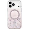 ハート型のグリッターが散りばめられたクリアケース/キラキラしたマグネットリング/スリムで手にフィット/盛り上がったカメラベゼルを備え、レンズ表面への接触から守る/最大2.5mからの落下に耐える/擦り傷からも保護する耐久性/磁気ワイヤレス充電に対応