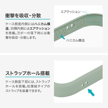 【耐衝撃】 衝撃を吸収するTPUと、硬く高透明なポリカーボネートのハイブリッドケース/柔軟なポリカーボネートなので着脱時にも割れにくい/レンズ周りを高く設計/ボタンやカメラレンズ周りを徹底保護する精密設計/写真やステッカーを使ったアレンジも楽しめる背面クリア仕様/ストラップホール搭載