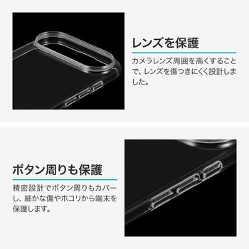 高透明で柔らかなTPUケース/柔軟性があり着脱が簡単/ボタンやカメラレンズ周りを保護/マイクロドット加工で端末に張り付きにくい/ストラップホール搭載