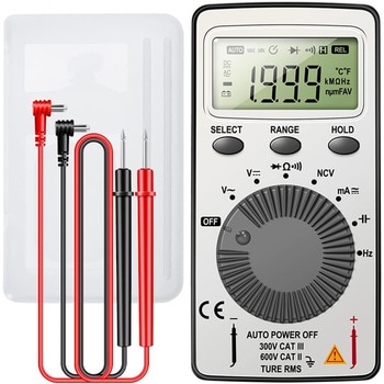 手帳型の保護ケースが付属したコンパクトなデジタルマルチメーターです。電圧・電流・抵抗・周波数などの基本測定に加え、導通チェックやNCV(非接触電圧)検知機能も搭載。ケースはスタンド機能付きで、立てかけての使用も可能です。