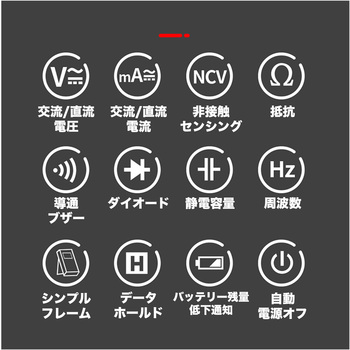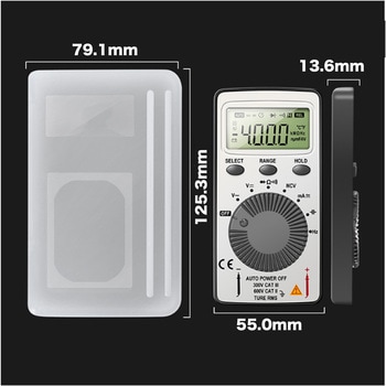 付属品保護ケース, テストリード材質【テストリード】PVC・真鍮寸法(mm)125×80×19質量(g)102電源CR2032 ボタン電池×1(別売)長さ(cm)【テストリード】約49周波数0Hz~4MHz・±(2.5%+10digits)機能ダイオード測定機能・データホールド機能・通電ブザー機能・NCVセンシング機能・自動電源オフ機能最大表示4000交流電圧0mV~600V・±(1.5%+10digits)直流電圧0mV~600V・±(1.2%+5digits)直流電流0mA~200mA・±(1.5%+8digits)抵抗0Ω~40MΩ・±(1.5%+10digits)交流電流0mA~200mA・±(2.5%+10digits)静電容量0F~4F・±(5.0%+6digits)内容量1個