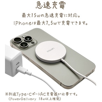 高出力充電に対応するスマートフォンは最大15Wの急速充電、iPhoneは最大7.5Wで充電できます。