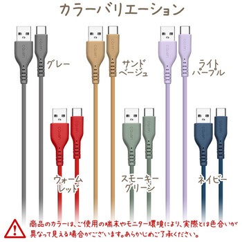 calonシリーズ 充電と通信に対応したUSBケーブル(USB Type-Ato USB Type-C)です。シリコン素材を採用した柔らかく、なめらかな手触りのケーブルです。USB Type-Aポートを搭載したパソコン、AC充電器やDC充電器等から充電する事が可能です。本製品は3Aまでの高出力充電器でお使いいただく事が可能です。本製品をパソコンに接続する事により、端末とパソコン間でのデータのやりとりができます。シリコン製のケーブルバンドが付属しています。