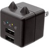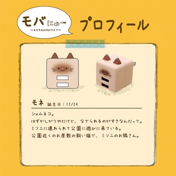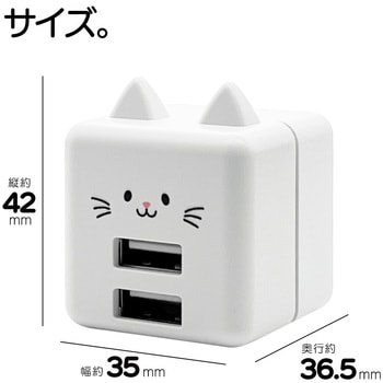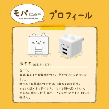 本製品は、モバにゃーシリーズ USB Type-Aポートを2個搭載したAC充電器です。本製品の2ポート合計最大出力は5V/2.4Aです。入力電圧は100-240Vに対応しています。本製品は、Smart ICを搭載しています。iOS(iPhone、iPad等)とAndroid(スマートフォン、タブレット等)を自動で識別し、最適な電流値で充電する事が可能です。電源プラグは持ち運びに便利な、90°回転収納式を採用しています。