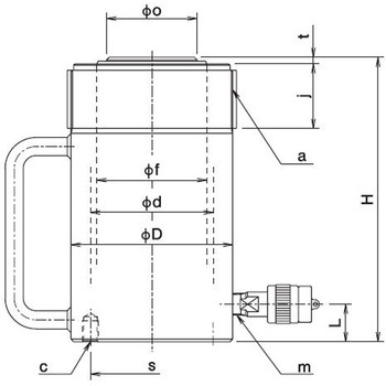 ピストンロッドはメッキ付きです。底部に取付用のネジを設けています。ピストンロッドに付着するゴミ除去用ダストシール付。シリンダー外径に取付用のネジを設けています。E30はサドルハメ込みタイプ、E50はボトル取付タイプです。最低高さを極力抑えました。天地逆使用の場合はネジ込みタイプのサドルをご使用下さい。許容横荷重は揚力の1/20です。単動S(スプリング戻り)タイプ取手付