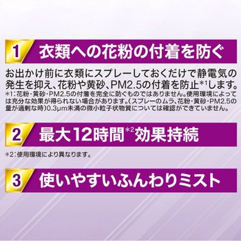お出かけ前に服にスプレーすることで、帯電防止効果により花粉の付着を防止します。