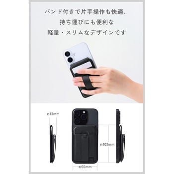 iPhoneに便利をプラス!MagSafeで簡単に着脱できる、MAGKEEPシリーズのカードスタンドです。スマートフォンとICカードの磁気防止シート付きで、改札を通るときもスムーズ。スタンドとしても使え、さまざまなシーンでも快適に動画視聴ができます。指を入れることができるバンド付きで、片手操作や持ち運びに便利です。