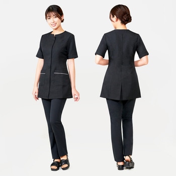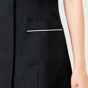 接客のプロフェッショナルのために作られた特別なチュニック。美しいシルエットの上品なノーカラーのチュニックコート。シンプルなデザインでパッチポケットをあしらい、フロントファスナーを開けることで羽織ることもできる2WAY仕様。背中のボックスプリーツとストレッチ生地の使用により動きやすさをプラスした機能性も高い1着。