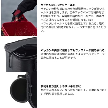 しっかりバッカンにホールドする柄杓ホルダーバッカンを置くのに不安定な斜めの磯や柄杓を落とせない潮の流れが速い遠征時の離島など、どんなシチュエーションでもしっかりバッカンにホールドできる柄杓立てが登場しました。新開発のフックがバッカンのフチにぴったりフィットして大切な柄杓を落とさない磯師の便利アイテムです。