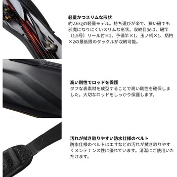 現行のロッドケースよりもスリムで軽量でありながら、剛性と耐久性があり、しっかり使い込める。狭い沖磯で、チャラン棒に掛けるときや荷物の受け渡しなどのシチュエーションで軽量、コンパクトな本製品が活躍します。厳選したタックルで荒磯に挑む磯師におすすめしたいリミテッドプロモデルです。